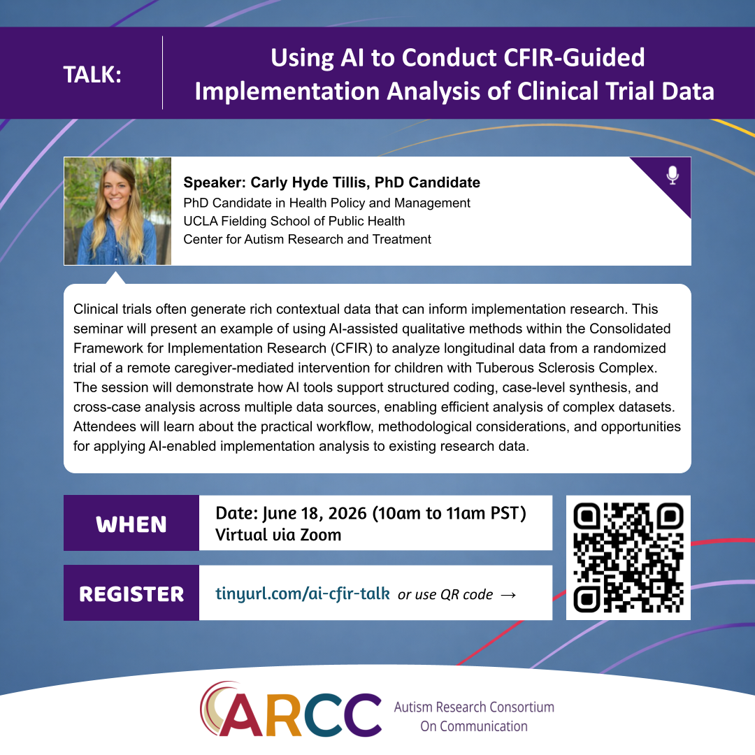 Using AI to Conduct CFIR-Guided Implementation Analysis of Clinical Trial Data Apr 29 Written By Kasari Lab Speaker: Carly Hyde Tillis, PhD CandidateJune 18th, 2026 via ZoomRegister: tinyurl.com/ai-cfir-talk Kasari Lab
